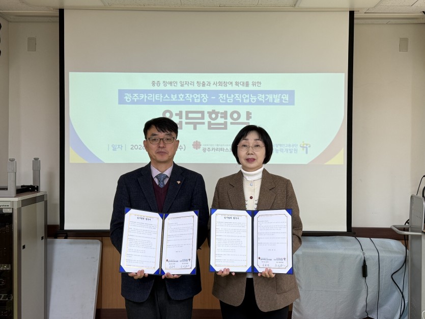 한국장애인고용공단 전남직업능력개발원과 광주카리타스보호작업장 업무협약식을 진행하였습니다.