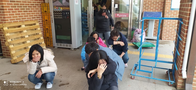 ◎ 1층 작업장에서 작업 도중 화재가 발생한 상황을 가정하여 전 직원을 대상으로 대피 훈련을 실시함.