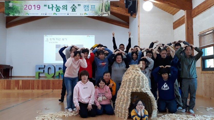 2019년 3월 26일~27일(1박2일) 간 한국산림복지진흥원 산하 시설인 국립장성숲체원에서 지원하여 [나눔의 숲] 캠프에 다녀왔습니다. 근로장애인 30명과 직원 및 봉사자를 포함하여 총 36명이, 숲 속에서 자연물을 이용하여 놀이를 즐기고 숲의 여유로움을 느끼는 시간을 가졌습니다. 미송칩 목재 카프라를 이용한 구조물 쌓기와 액자를 만드는 시간을 통하여, 반복된 일상으로 인해 지친 근로 장애인들과 직원들에게 힐링의 시간이 될 수 있었던 뜻깊은 캠프였습니다.