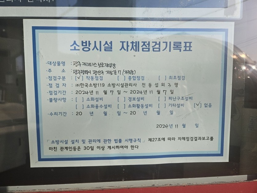 2024년 11월 07일 소방작동기능점검 결과계시 페이지 정보 작성자 주선 댓글 0건 조회 1,682회 작성일 24-11-13 09:29 본문 본 카리타스보호작업장에서는 2024년 소방작동기능점검을 실시하고 그결과를 계시함. 목록 이전글2024년 4분기(4차) 근로시설, 보호작업장 공동운영위원회 24.12.04 다음글2024년 "6차 찾아가는 보호작업장"(2024년 10월 29일) 24.10.29 댓글목록 댓글목록 등록된 댓글이 없습니다.